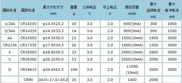 标称容量1400mAh、额定电压3.0V、最大连续工作电流2000mA、最大脉冲电流3000mA、电池尺寸14.5*50.5mm、电池重量21g、工作温度-40℃---+85℃